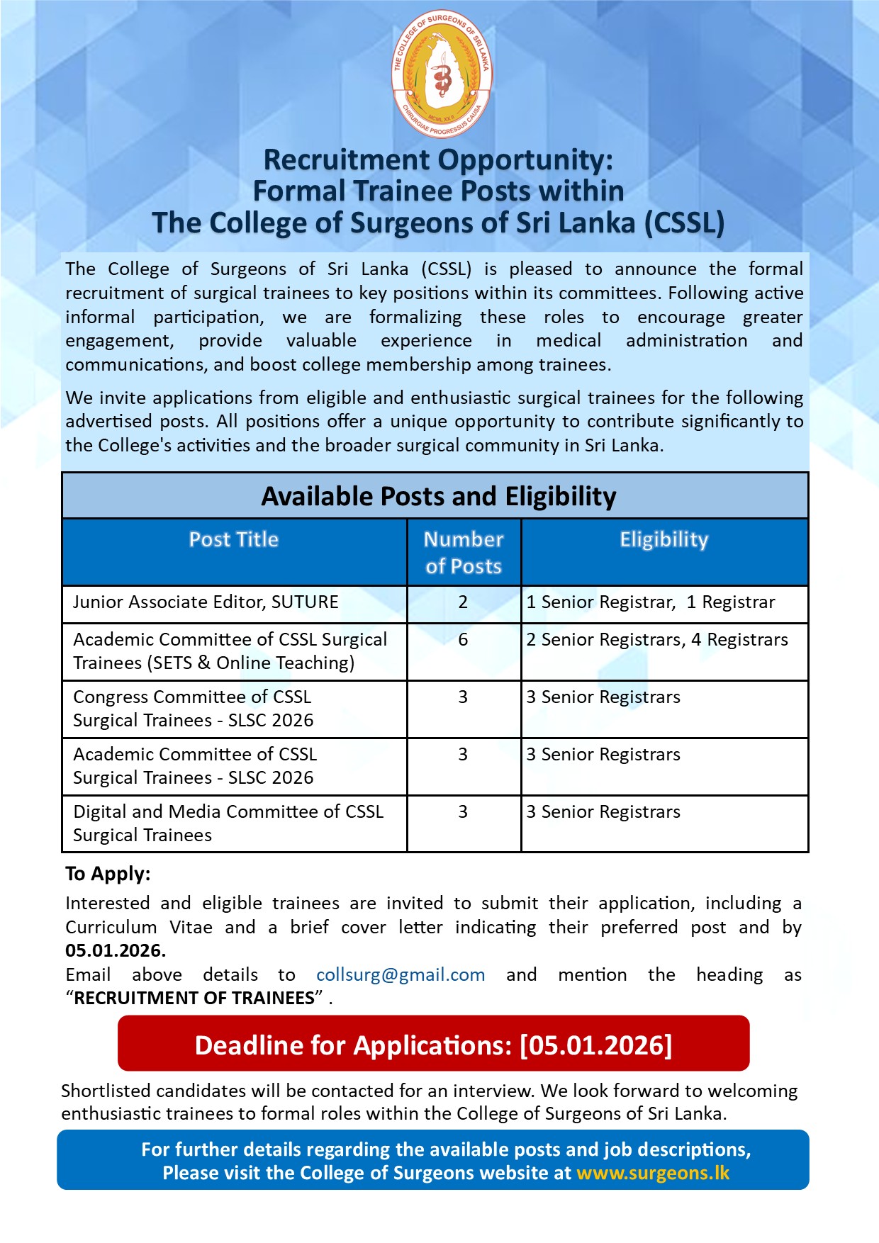 Recruitment Opportunity: Formal Trainee Posts within The College of Surgeons of Sri Lanka (CSSL)