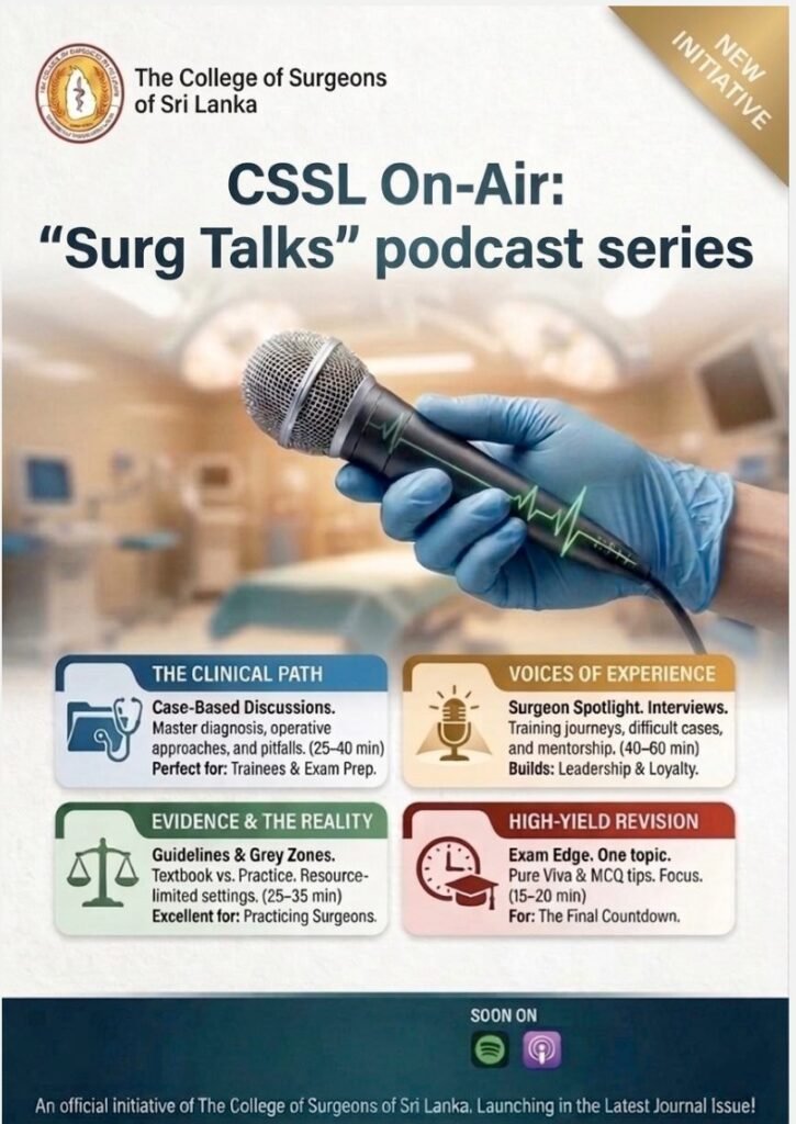 Exams Awards Training/Courses Education Portal Podcast Audit Podcast Council 2026 Join the College Join the College of Surgeons of Sri Lanka to access professional development programs, educational resources, and a network of leading surgical professionals.
